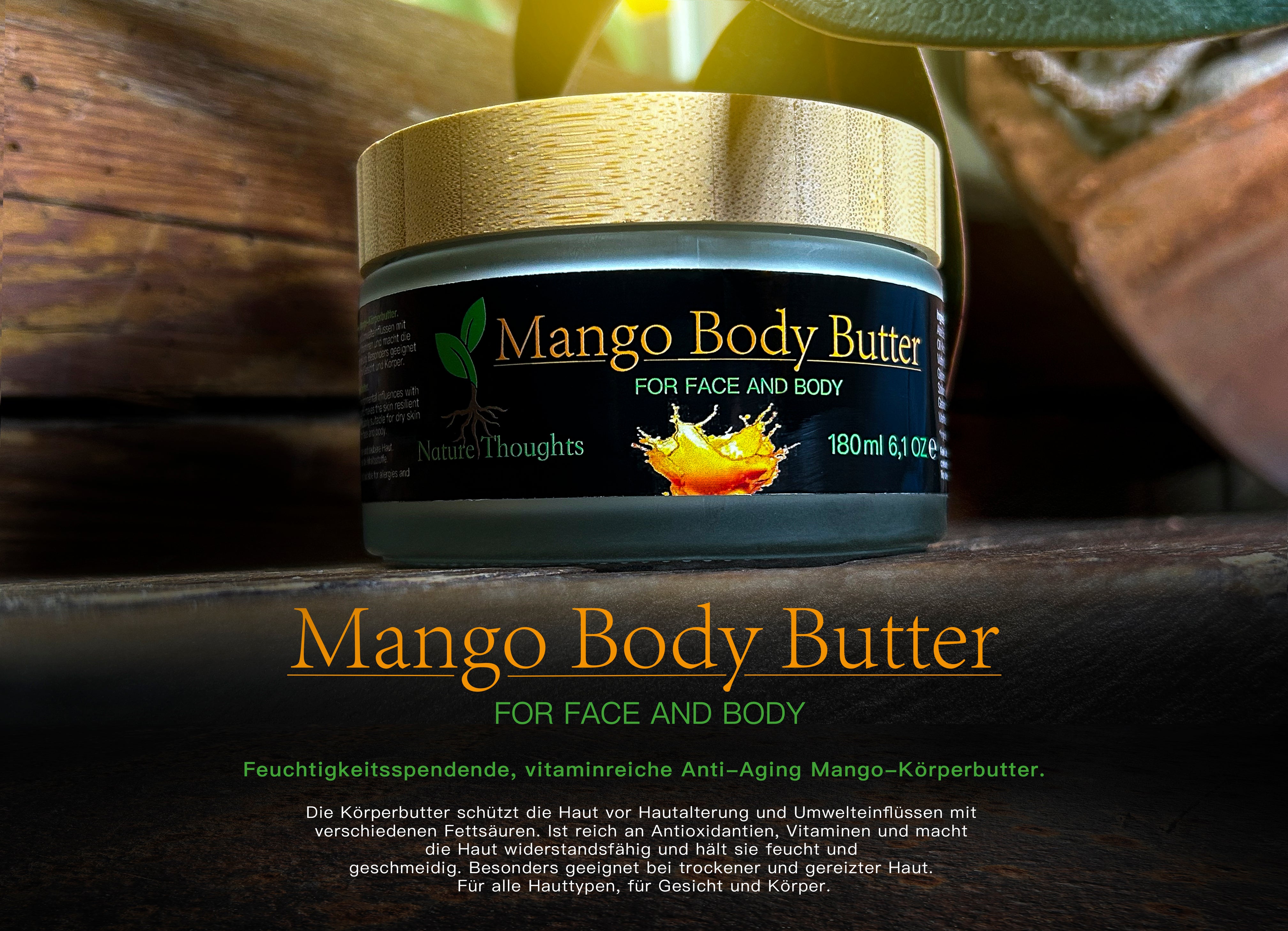 Die Mango Body Butter fördert die Hautregeneration und spendet irritierter Haut Feuchtigkeit, Geschmeidigkeit und Elastizität. Diese unterstützt die Zellerneuerung und glättet die Haut. Alterungsprozesse können verlangsamt werden und die Regeneration der Hautzellen wird unterstützt. Die Mango Body Butter zieht schnell ein und hinterlässt keinen klebrigen Fettfilm, ihre Konsistent ist eher fest und somit sehr ergiebig. Der Duft ist dezent fruchtig frisch.